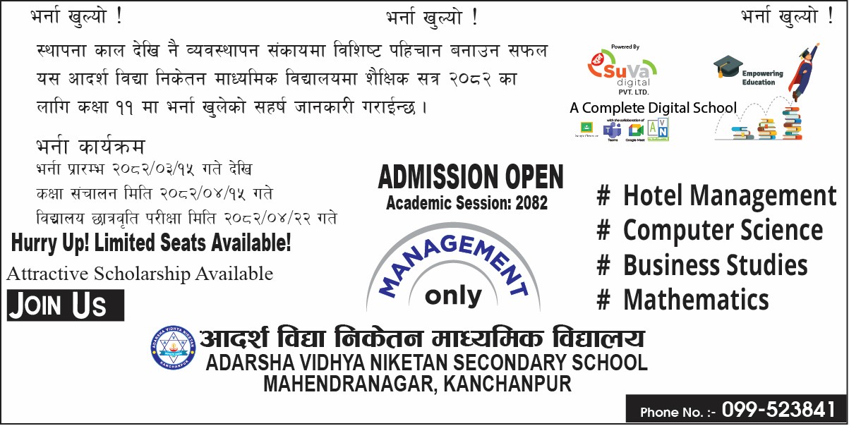 भुवन भट्ट/महेन्द्रनगर । कञ्चनपुरमा जेनजी समूहका युवाहरूले आत्मिक प्रतिबद्धता गर्दे सार्वजनिक क्षेत्रमा उठबस गरेका छन् । शुक्रबार साँझ जेनजी समूहका झन्डै ३० बढी किशोर तथा युवाहरूले आत्मिक प्रतिबद्धता गर्दै १०...